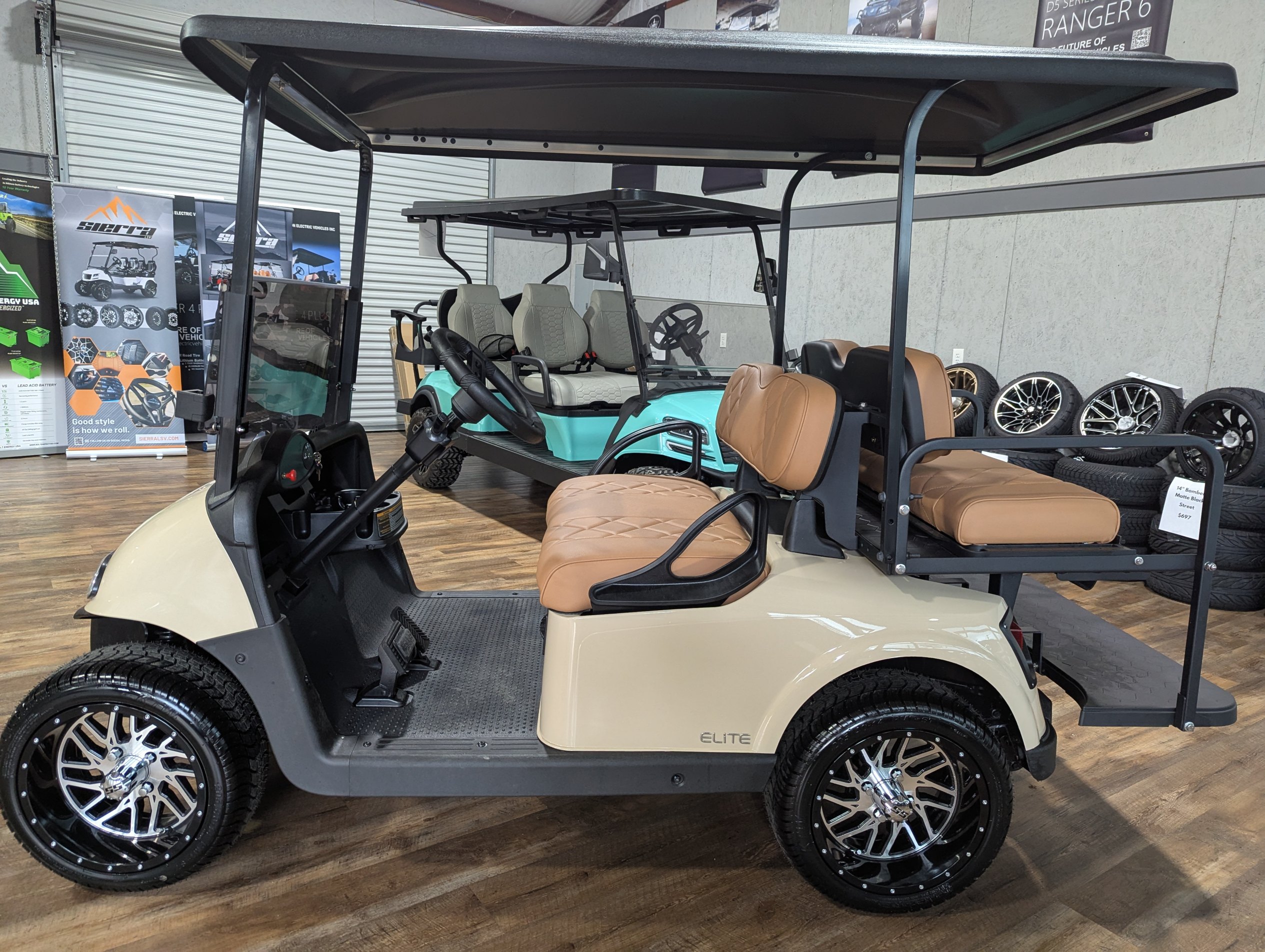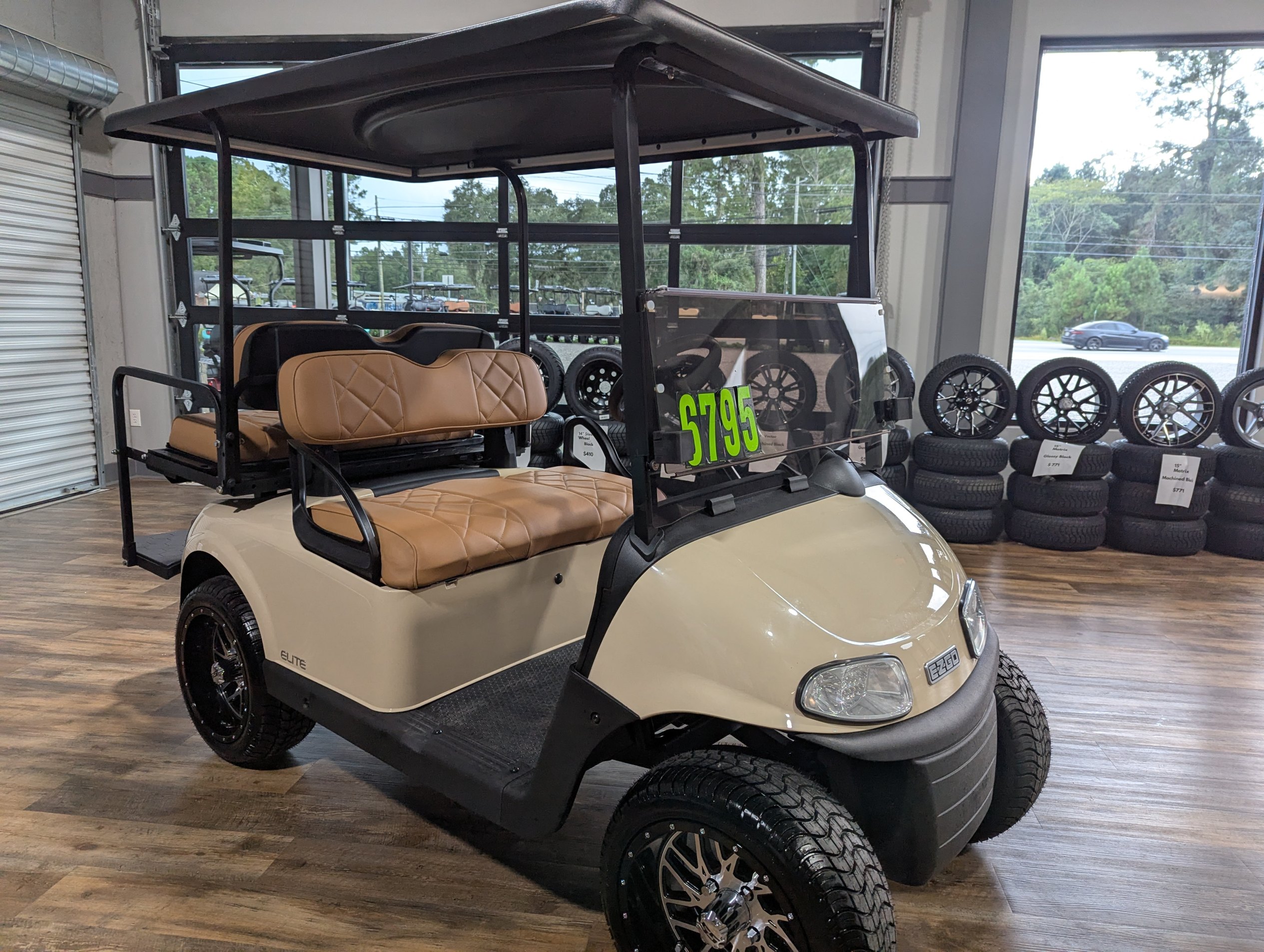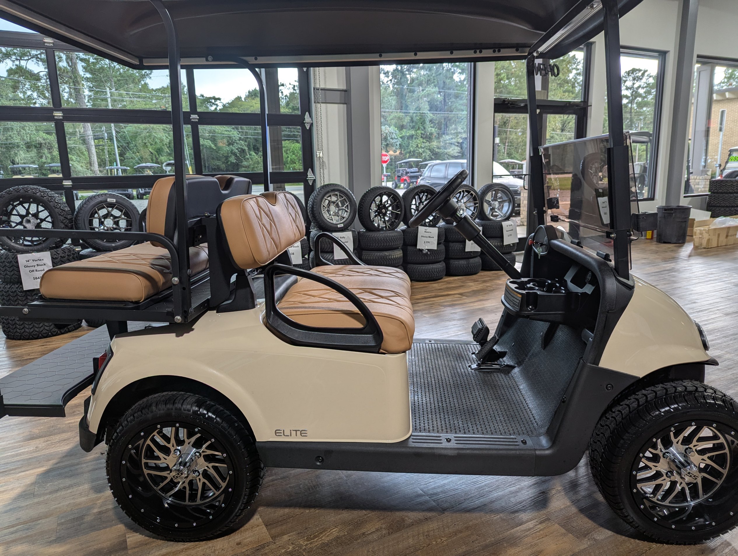 Turn heads on and off the course with this beautifully refurbished 2020 EZGO RXV Elite. Finished in elegant Sandstone with custom diamond-stitched tan seats, this cart blends comfort and style. Outfitted with a dependable lithium battery, smooth ride suspension, and custom wheels and tires, it’s ready for weekends, neighborhoods, or resort cruising.